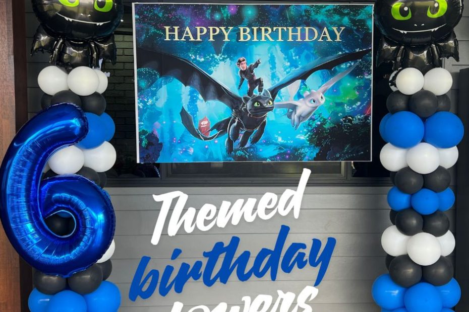 An example of how themed towers can add to your already brought banner. “How to train your dragon” was the theme, and the client provided the backdrop for the birthday celebrations on Saturday. Don’t the foil toppers look great along with an air-blown foil number attached to the tower. As this was an outside event we set the tower garland on a rental stand with weighted base.